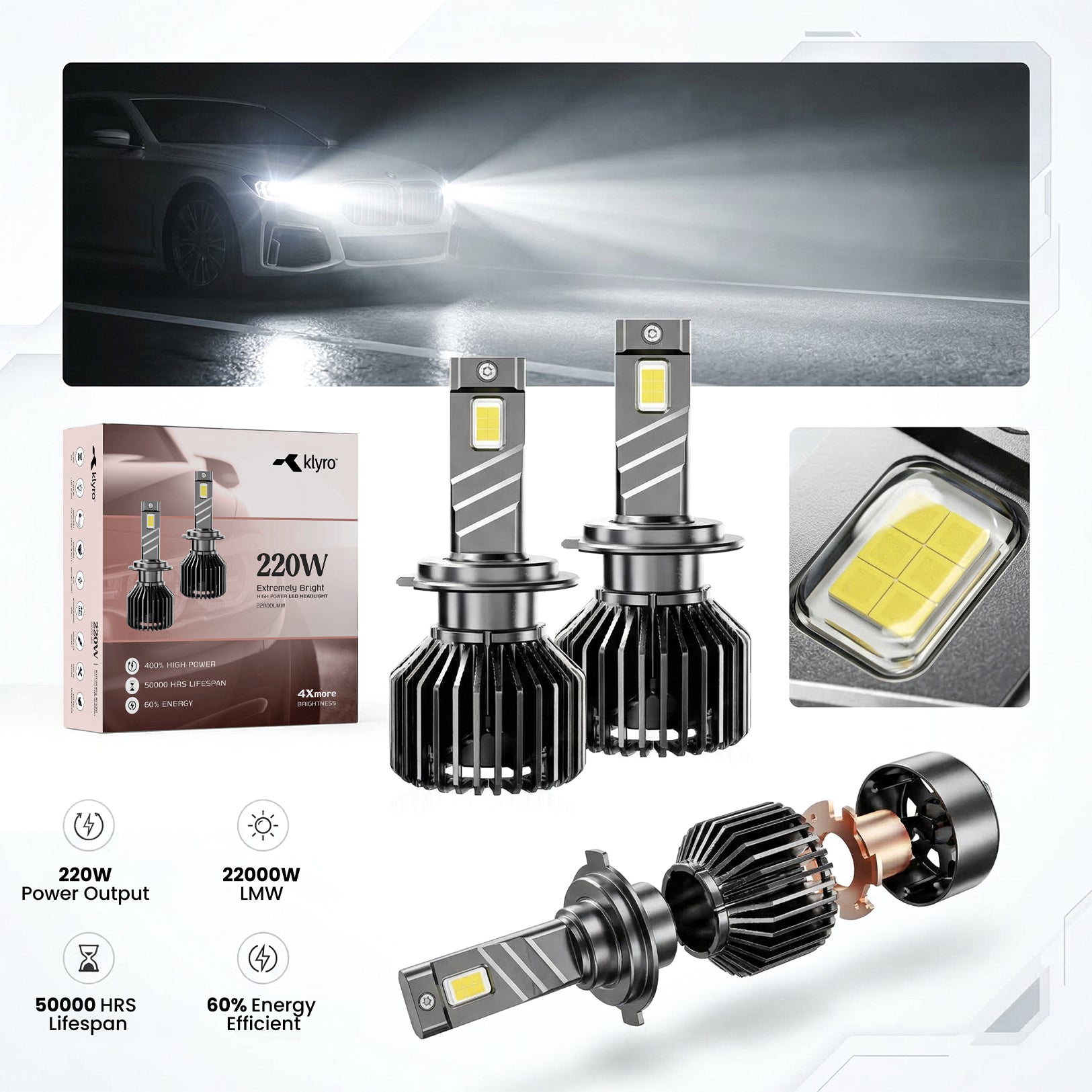KLYRO 220W headlight comes with 2 year warranty against manufacturing defects. Buy with confidence and drive worry-free.